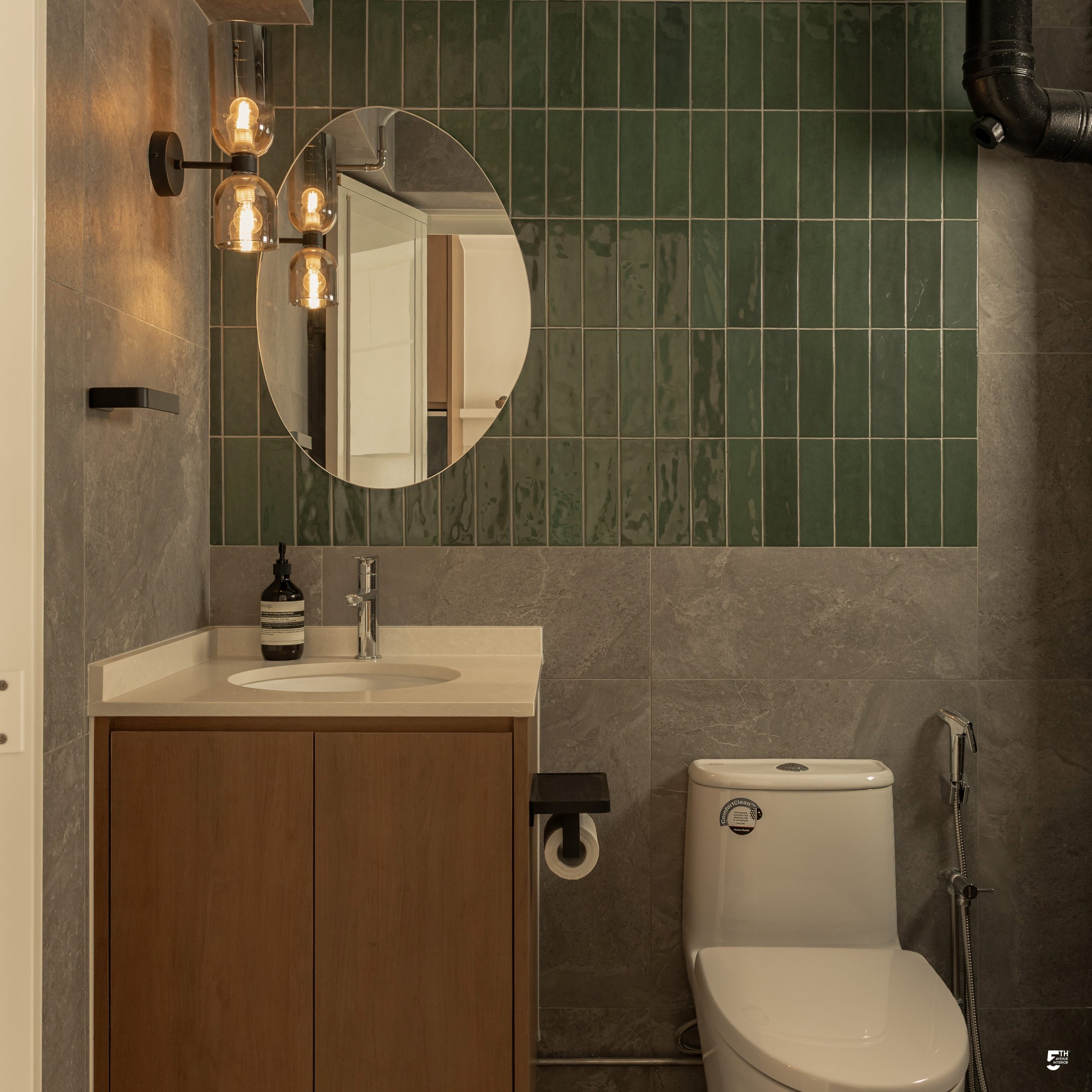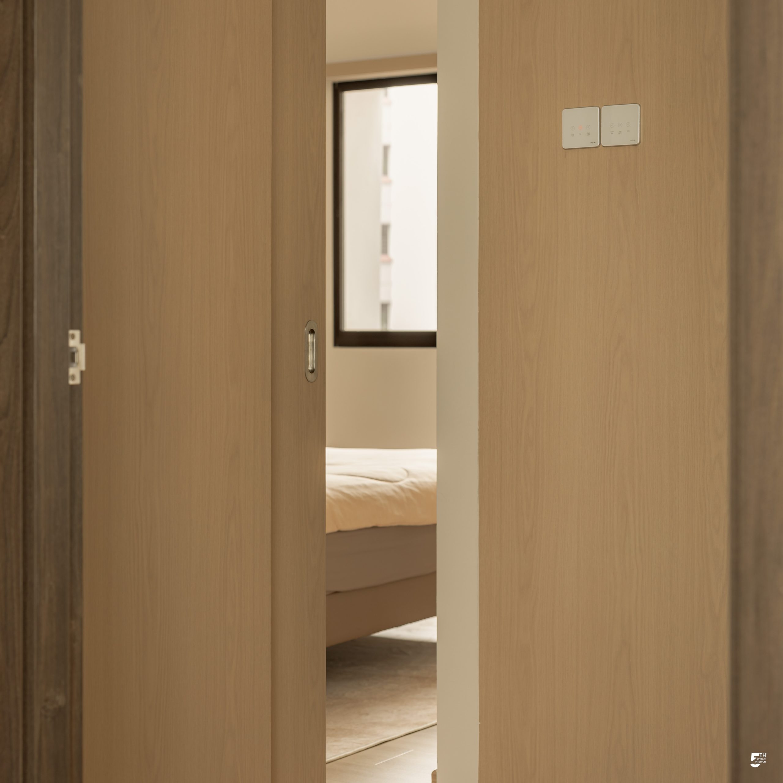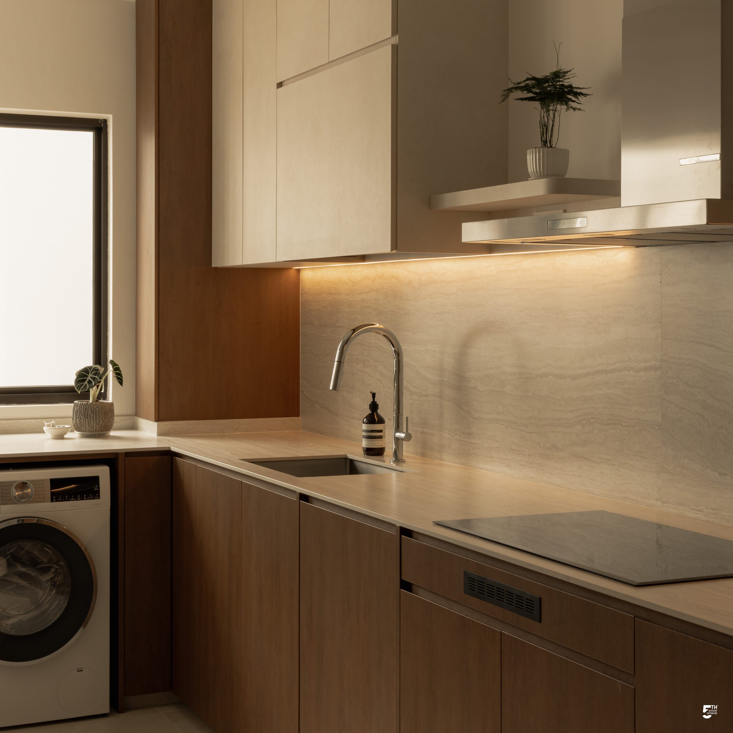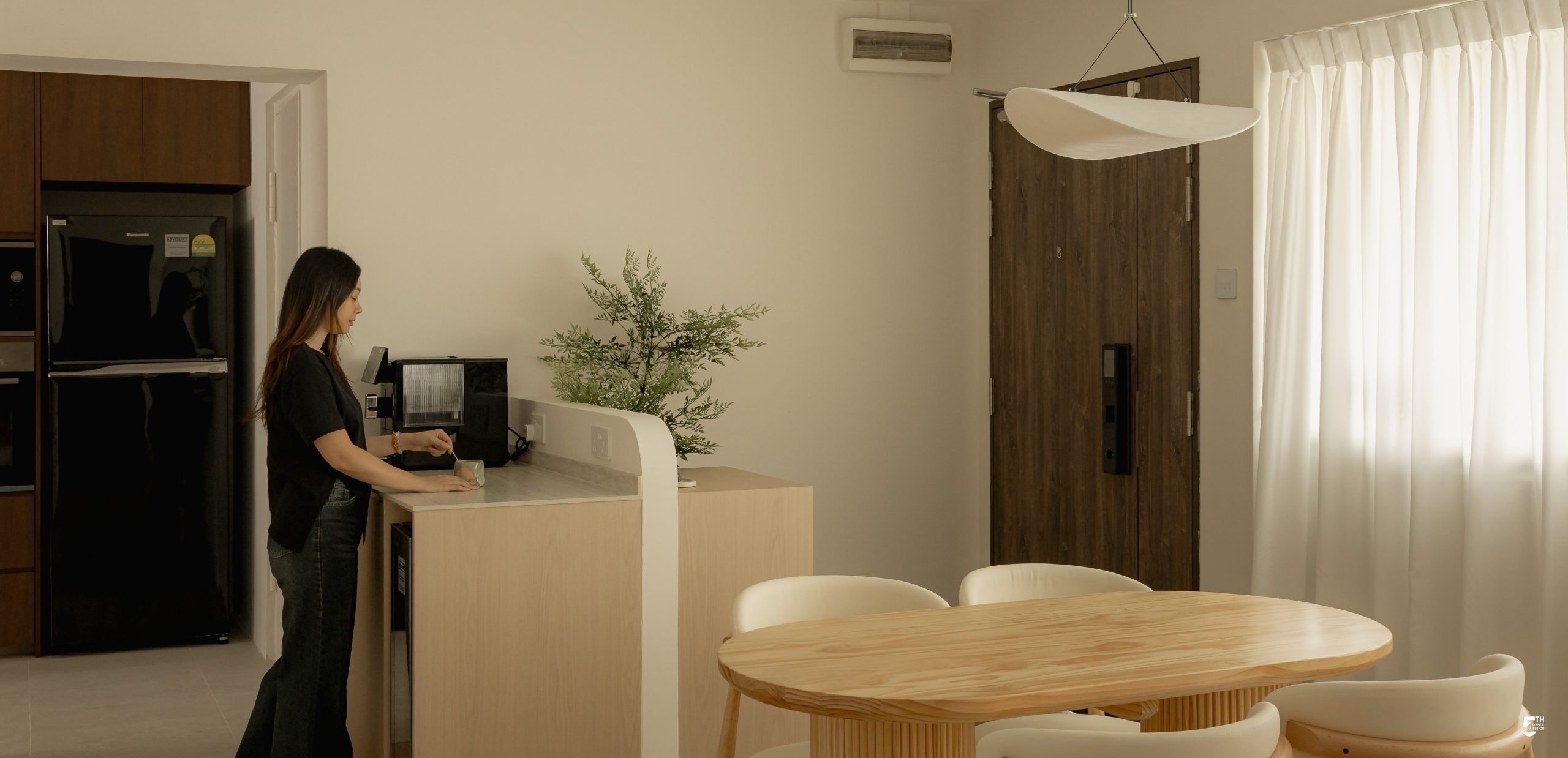 While the living space remains serene and Zen-like, the home takes an interesting turn in the kitchen. Mid-Century design is blended through darker laminates and deeper tones, instantly shifting the mood of the space. Its richer palette extends towards the nearby common bathroom, creating a grounded atmosphere. Despite the contrast, the different design approaches coexist harmoniously, each telling its own story without overpowering the other.